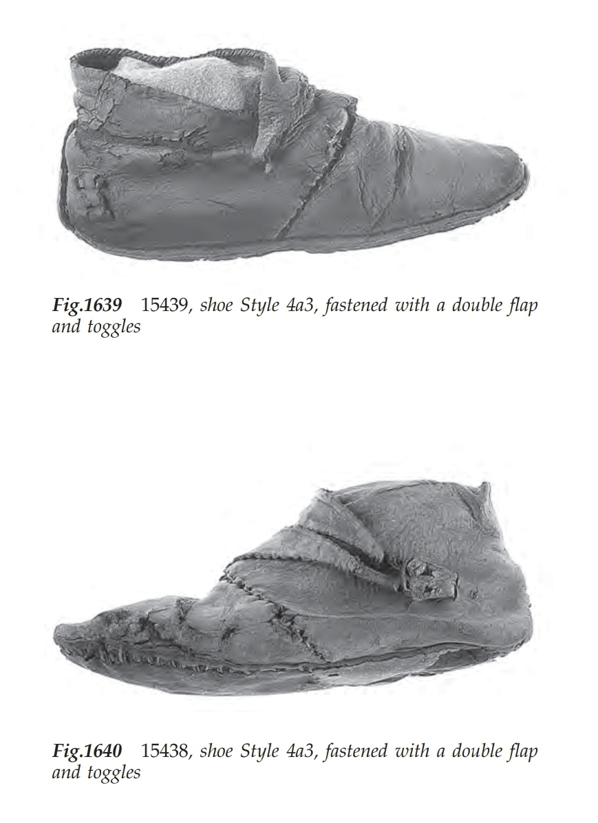 Shoes of Style 4a3 have been found at 16-22 Coppergate from the earliest layers of occupation (mid-late 9th century at the earliest) throughout the whole Anglo-Scandinavian period, but finds of this type are most numerous in the mid 10th century layers (Mould, Carlisle and Cameron, 2003). Shoes of this style were also found at nearby Hungate and fragments indicating this style have been found in Oxford also.